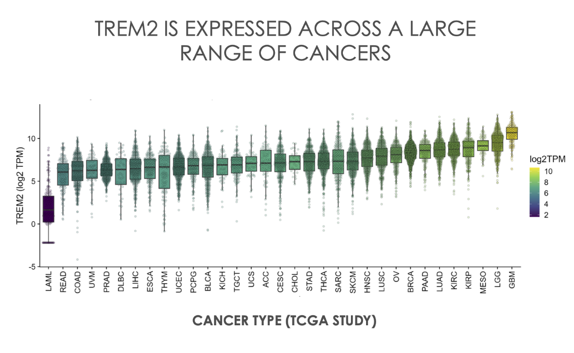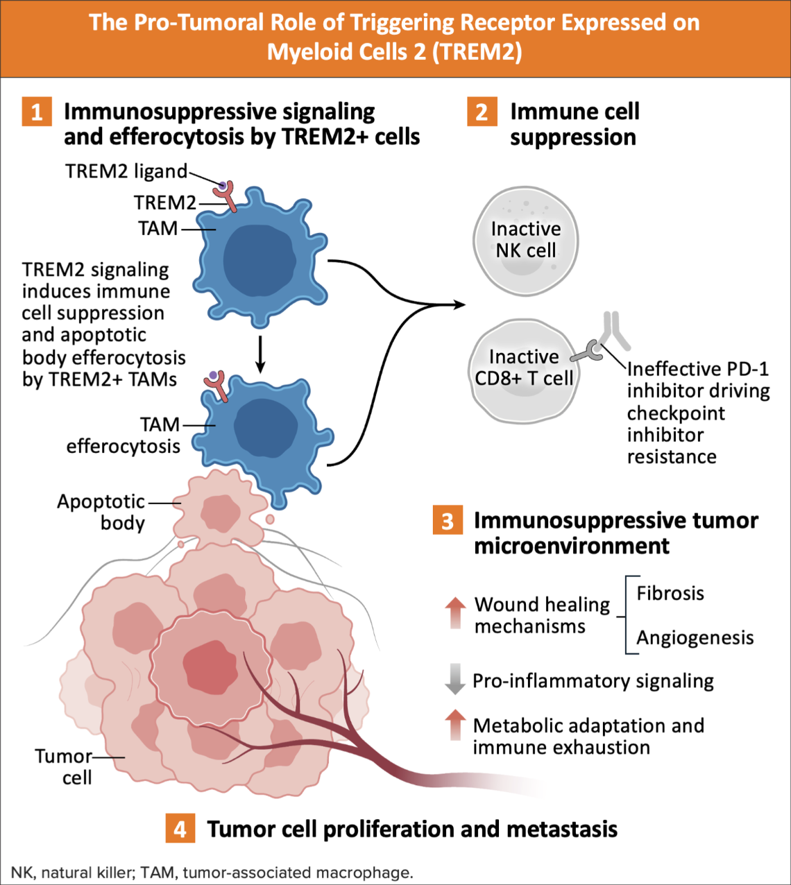 In cancer, triggering receptor expressed on myeloid cells 2 (TREM2) is overexpressed on tumor-associated macrophages (TAMs) in the tumor microenvironment (TME).1,2