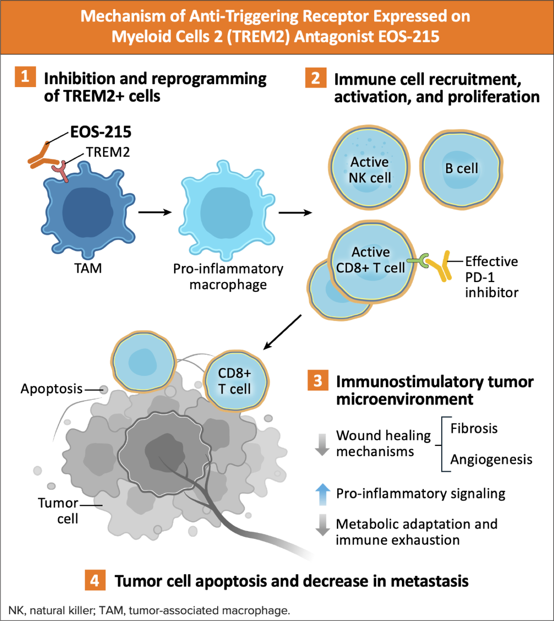 EOS-215 is a potent anti-TREM2 antibody that blocks ligand binding,7 disrupting key tumor-supportive functions of TAMs in the TME. By targeting TREM2, EOS-215 reprograms macrophages,7 creating conditions to allow for T cell activation and help overcome resistance to current standards of care.
