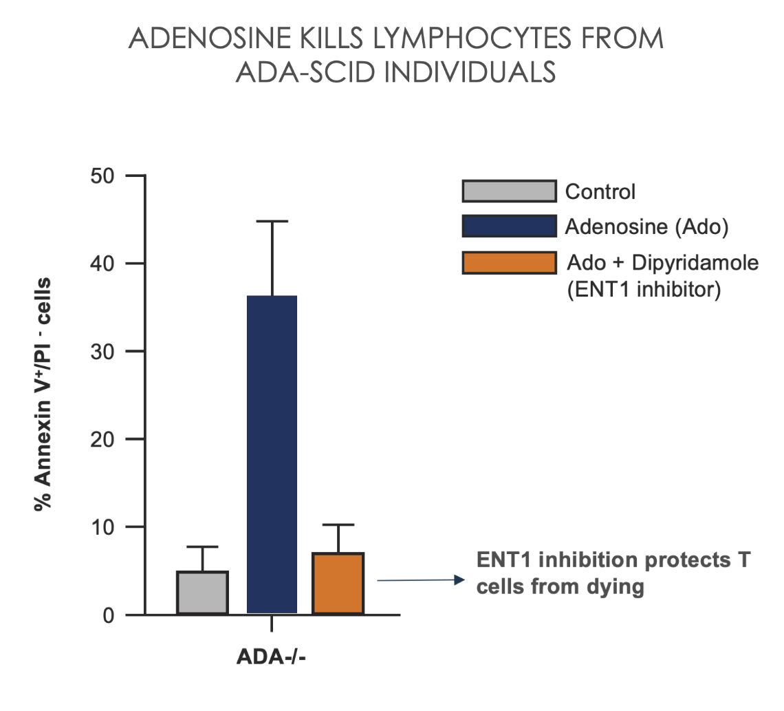 Severe Combined Immunodeficiency Disease (SCID) provides genetic validation that the excessive buildup of intracellular adenosine via equilibrative nucleoside transporter 1 (ENT1) induces apoptosis and impairs T cell function.1