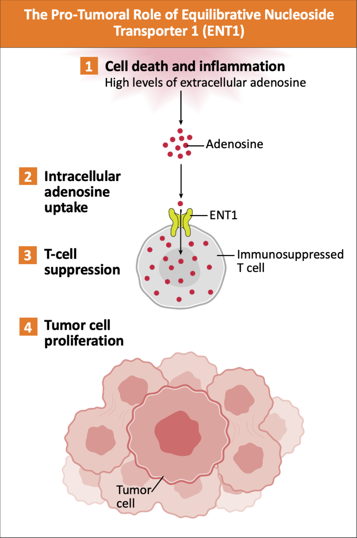 High levels of adenosine are present in most human tumors and its intracellular transport is regulated by equilibrative nucleoside transporter 1 (ENT1).2-4 High intracellular adenosine uptake has been shown to have various immunosuppressive roles in the tumor microenvironment (TME), in particular on T cell metabolism, expansion, effector function, and survival.1,2,3,5-9