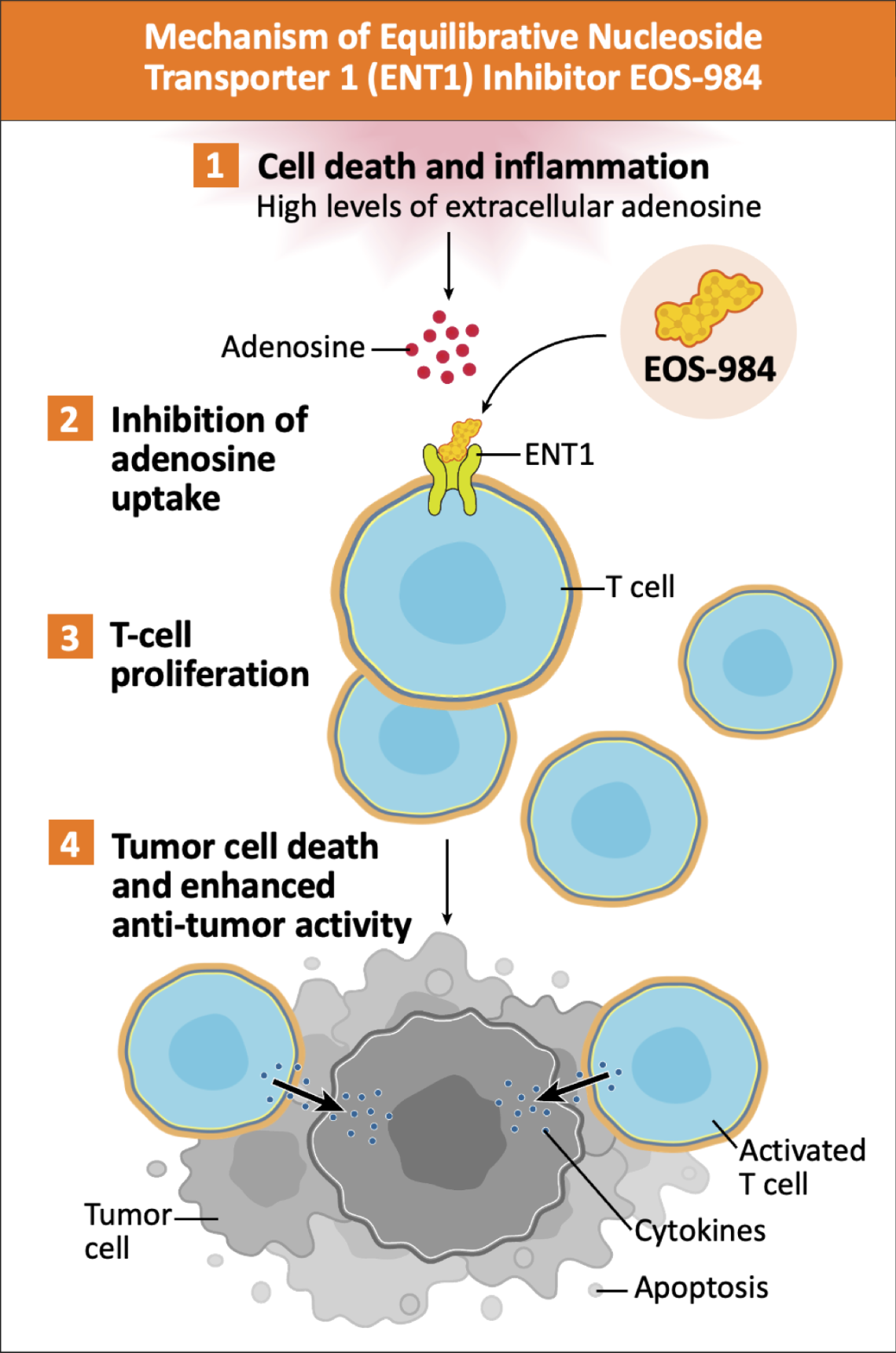 EOS-984 blocks the intracellular uptake of adenosine into T cells, through the inhibition of ENT1.3 This may relieve adenosine-mediated immunosuppression of tumor-infiltrating T cells, restoring their expansion and effector function.3