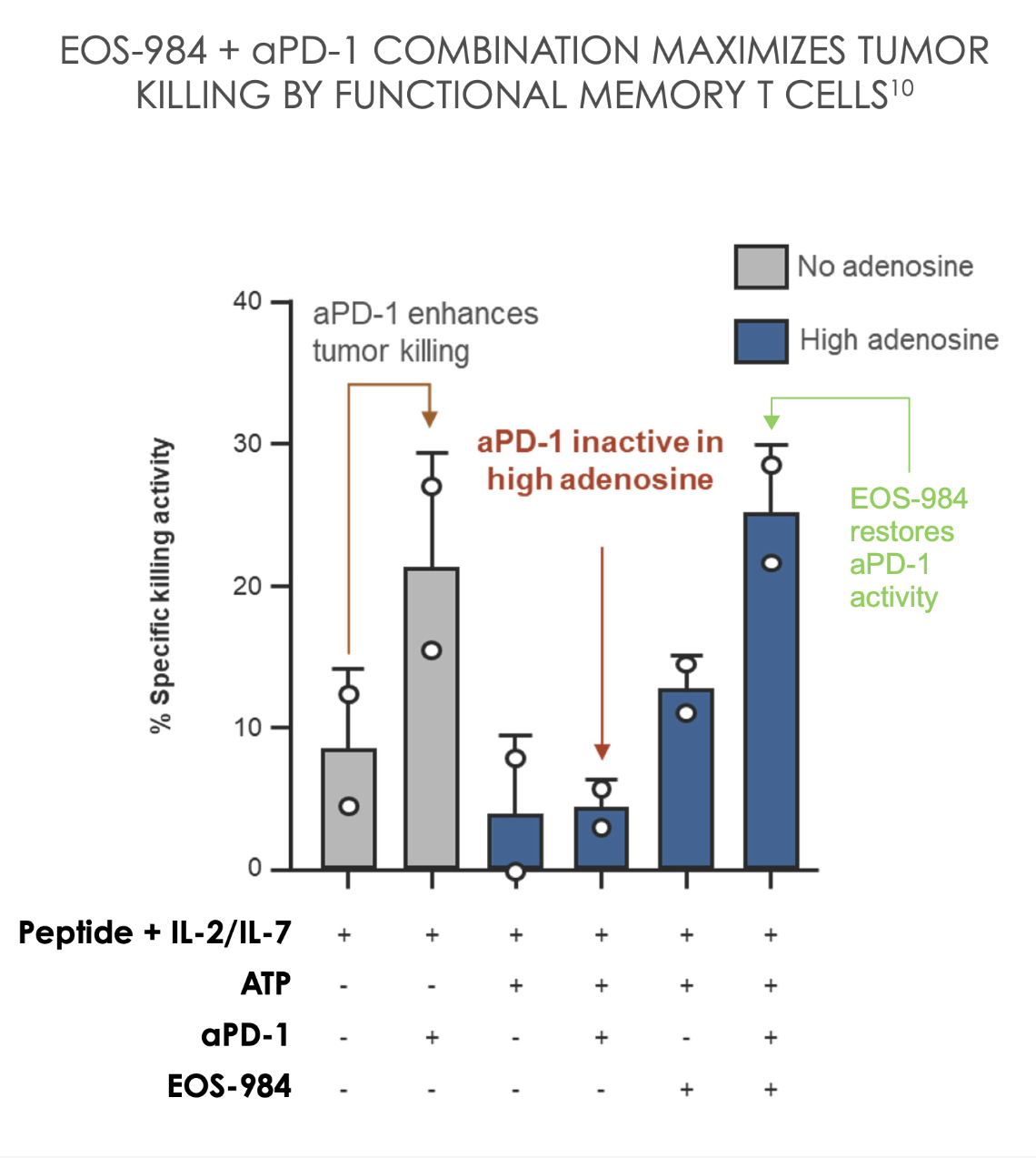 EOS-984 is a highly potent ENT1 antagonist, designed specifically to target the immunosuppressive effects of intracellular adenosine. Restoration of expansion and effector function of tumor-infiltrating T cells in high adenosine conditions has been demonstrated.10 EOS-984 is currently in Phase 1 clinical development in advanced solid tumors.